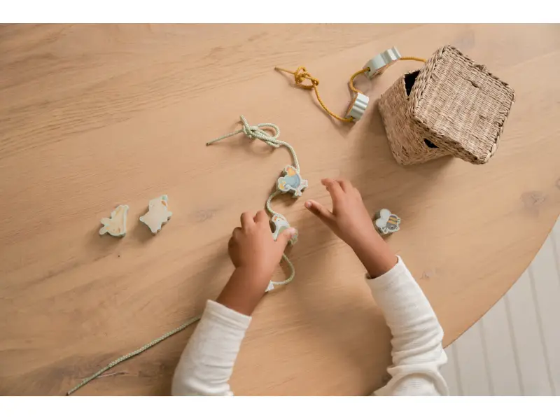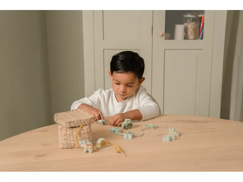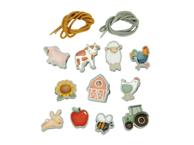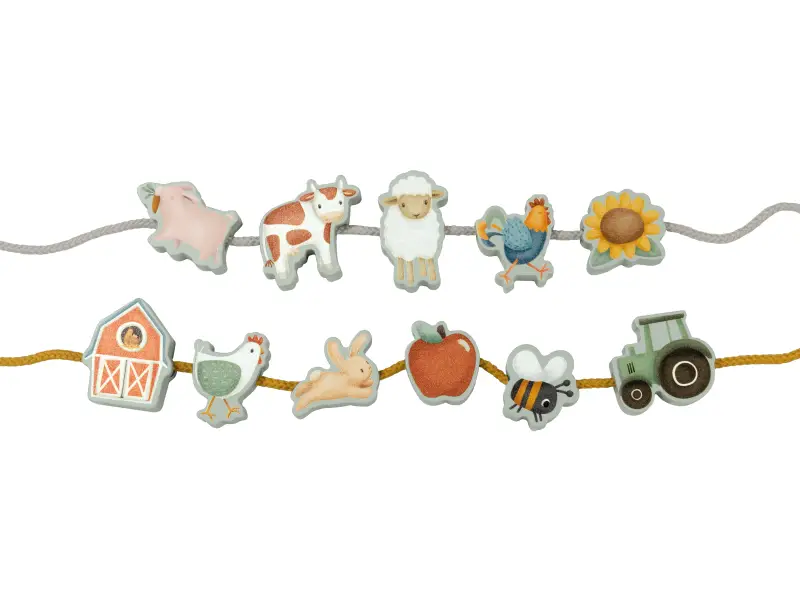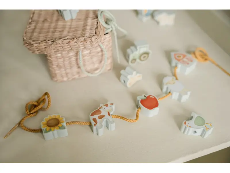 Originálne drevené korálky na navliekanie tvarované a potlačené motívmi zo života na farme. Pri navliekaní zvieratiek, traktora alebo jabĺčka môže dieťa vymýšľať príbehy, ktoré zažívajú kamaráti na farme, a vytvárať nové a nové kombinácie výsledného náhrdelníka. Šnúrka s plastovým zakončením uľahčuje navliekanie aj malým detským rúčkam. Prevliekaním dieťa trénuje jemnú motoriku, koordináciu rúk a očí a kreativitu.