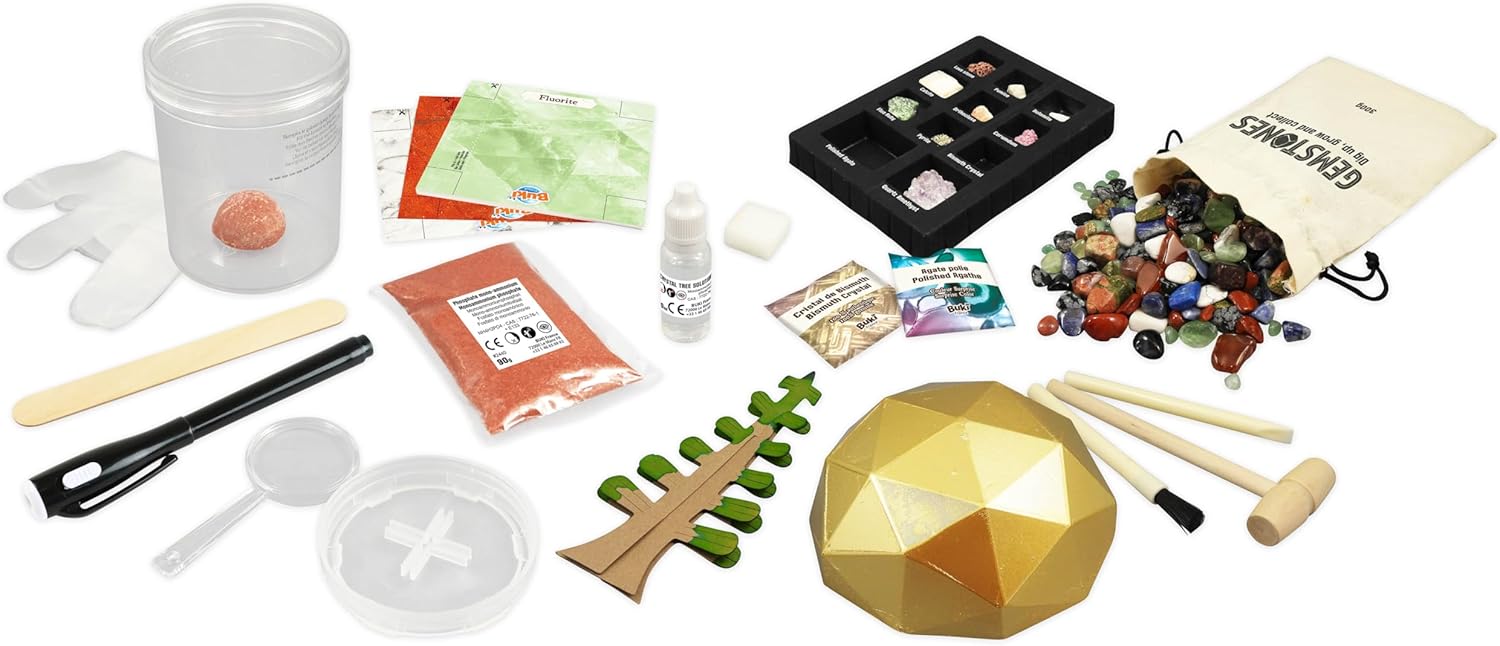 Obsah balenia: pohárik, 90 g prášku na pestovanie kryštálov, sada tekutého roztoku kryštálov (20 ml), stromček na pestovanie kryštálov, sáčok brúsených kameňov (cca 300 g) na porovnanie, blok sadry obsahujúci 8 surových kameňov na vykopanie, kladivko, dlátko a kefka, lupa, tyčinka na miešanie, špongia, pár rukavíc, miska/podložka na experimenty, pero s UV atramentom, 8 zložiek kariet a prekvapenie (achát/bismut), ilustrovaný farebný návod – slovenský preklad