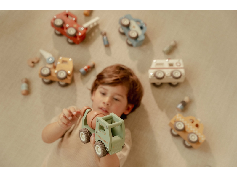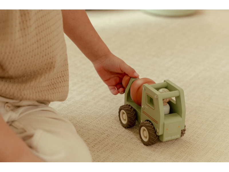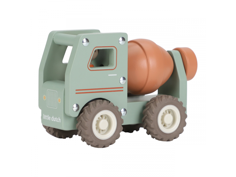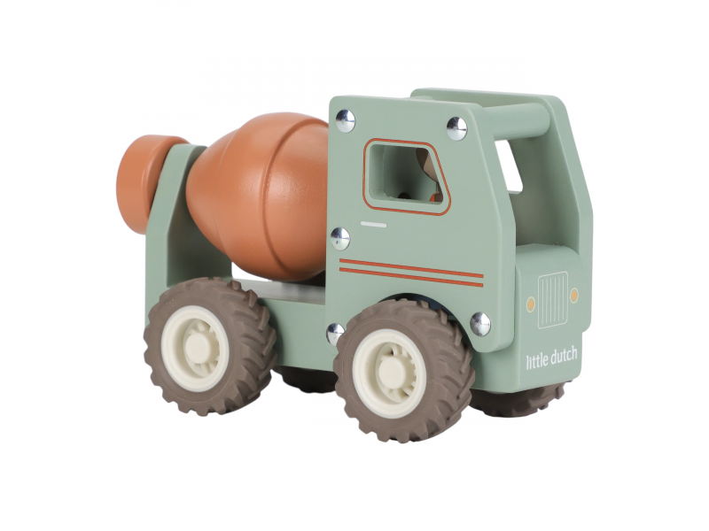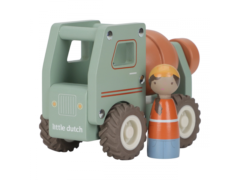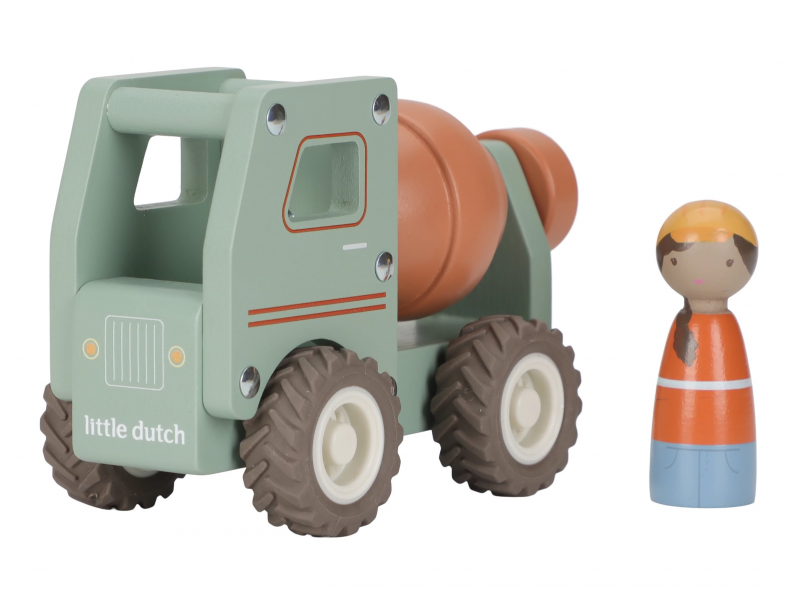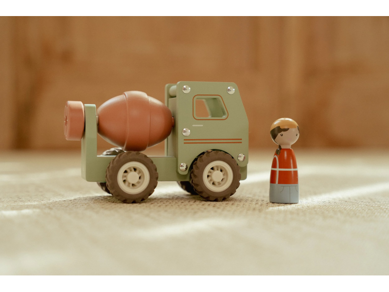 Miešať a stavať! Tento drevený miešač betónu je pripravený na prácu na stavbe. Pri jazde sa bubon miešačky otáča, takže vyzerá ako skutočná. Robustný nákladiak s gumovými pneumatikami zaisťuje hladkú a tichú jazdu. Súčasťou hračky je drevená figúrka stavbyvedúceho.