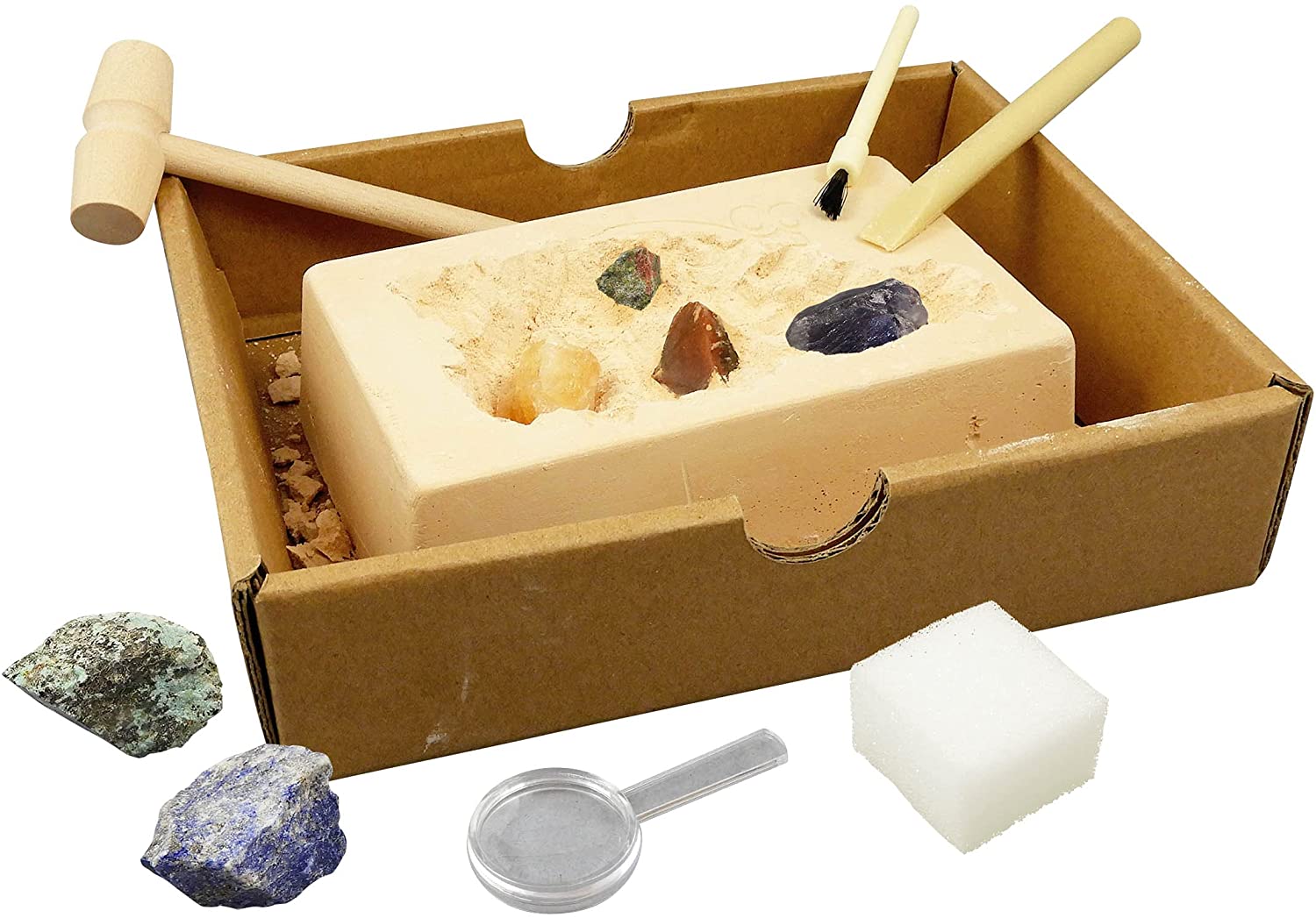 DIGKIT minerálne kamene od Buki France! Použite priložené nástroje k vykopaniu a analýze siedmich minerálov – ametyst, citrín, achát, lazurit, obsidián, tyrkys, unakit. Nájdené kamene očistite a pomocou lupy preskúmajte ich štruktúru a farbu. Krabička slúži ako miska pre zachytenie neporiadku.