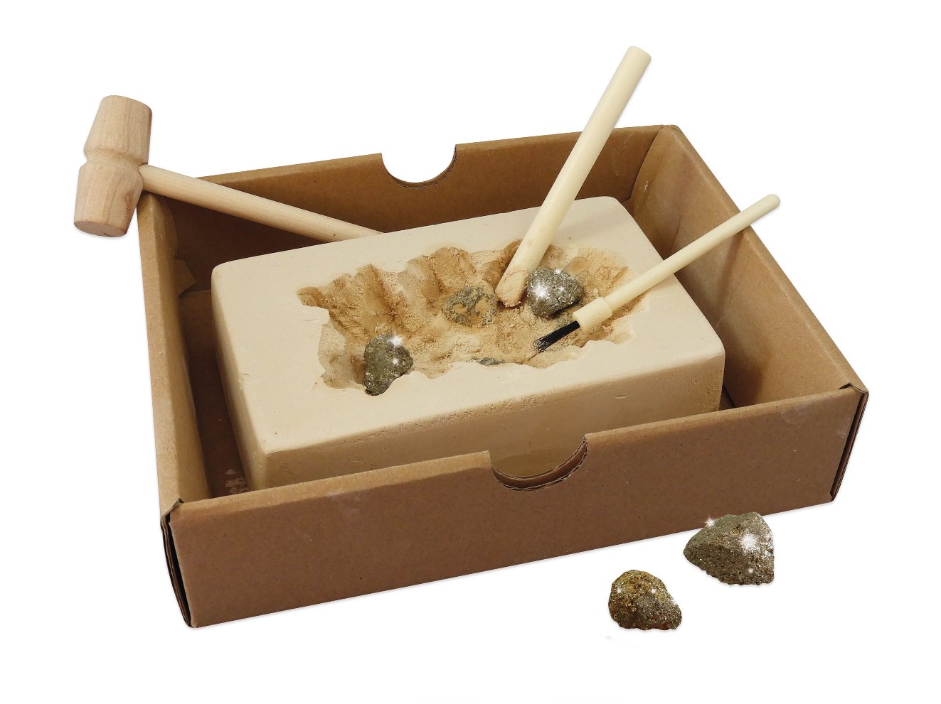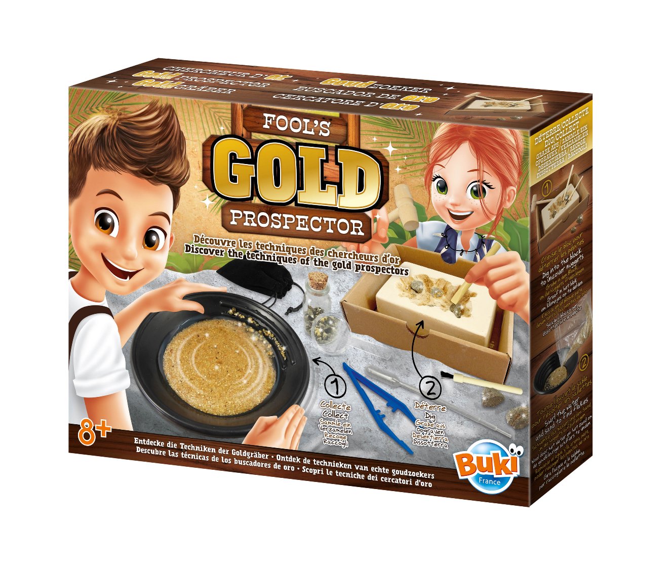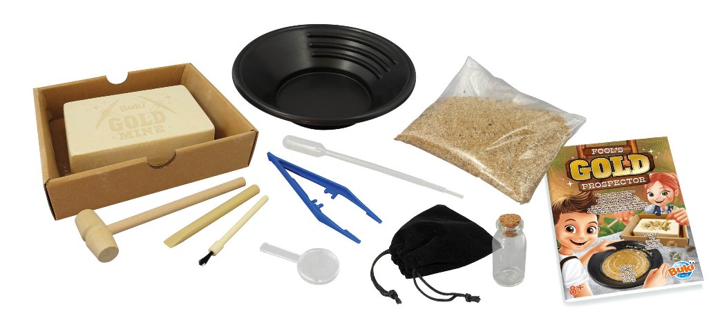 Zlatá horúčka od Buki France! S touto súpravou zažijete štipku z dobrodružných príbehov, ktoré nájdete v knihách Jacka Londona. Vyskúšate si dve metódy získavania zlata, a to vyťaženie zlatých nugetiek pomocou nástrojov z bloku hornín a tzv. „ryžovanie“ z piesku. Na tento účel poslúžia miska, piesok obsahujúci zlaté zrnká, pinzeta, pipeta a lupa. Nájdené zlato si môžete uložiť do pohára alebo tie väčšie kúsky do textilného vrecka, rovnako ako to robili dávni hľadači zlata. Krabice slúžia ako ochrana pred odlietavajúcimi kúskami sadry.