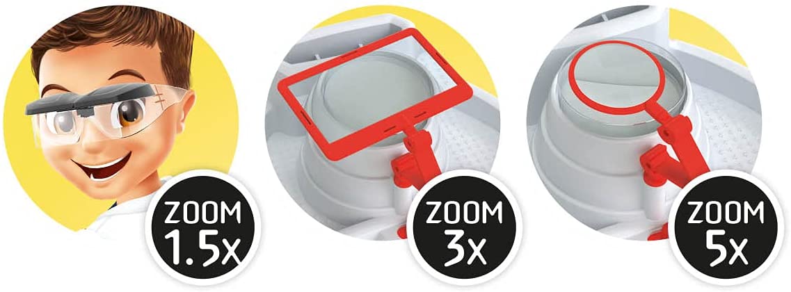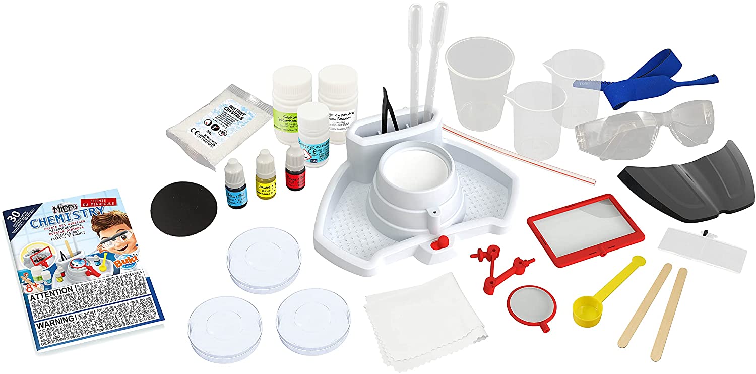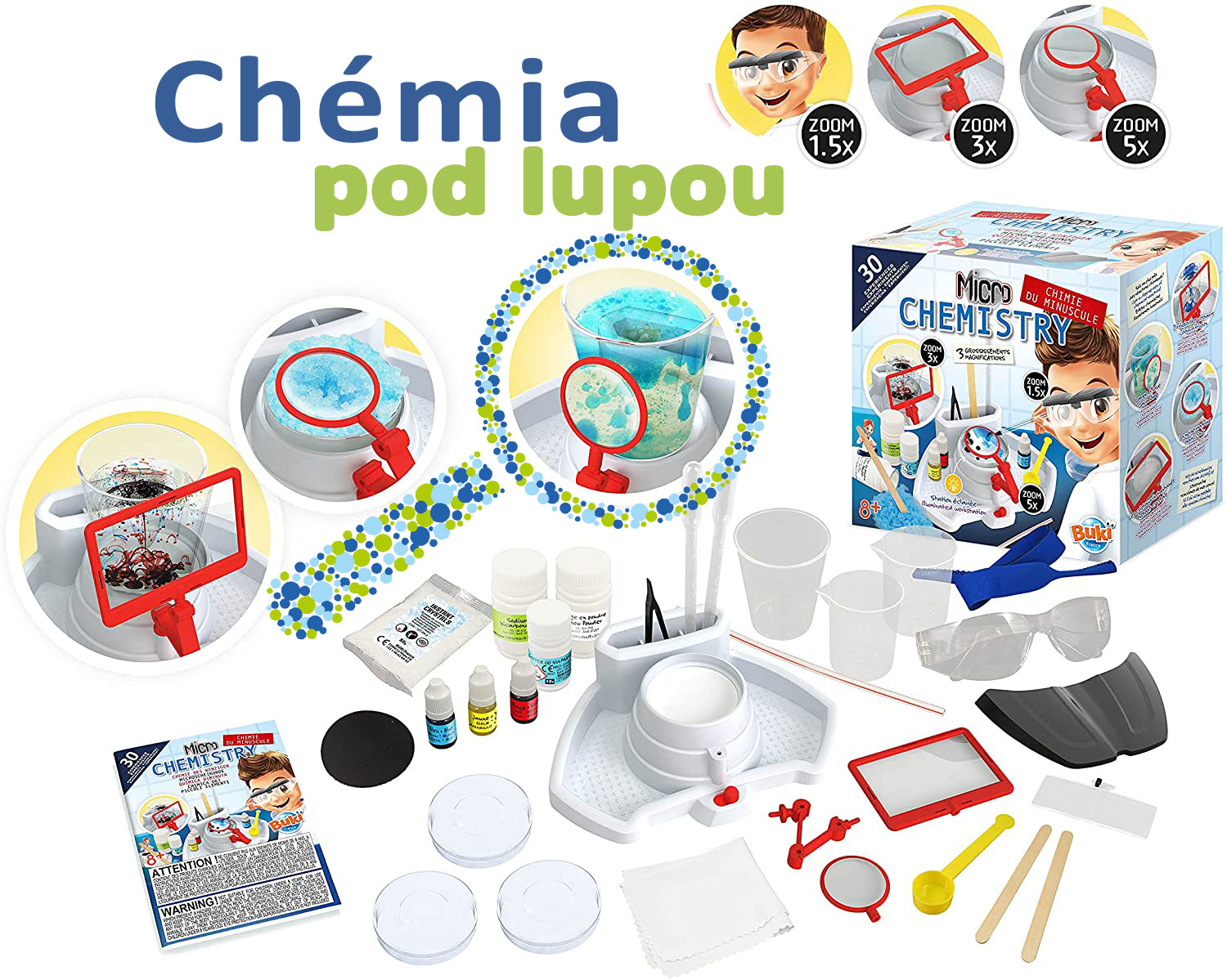 Obsahuje totiž 3 lupy, ktoré môžete umiestniť na experimentálnu stanicu a pozrieť sa tak bližšie na prebiehajúce chemické reakcie. Experimentálna stanica je osvetlená zdola, aby bol zážitok z pozorovania čo najlepší. Súčasťou súpravy sú ochranné okuliare, pipety, pinzety, kadičky, Petriho misky a chemické látky.