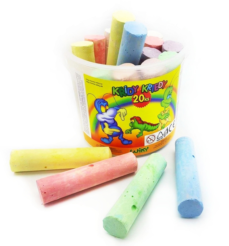 Farebné kriedy v plastovom kýbliku od Wiky! Kriedy majú guľatý tvar. Farby kried: červená, zelená, žltá, modrá, hnedá, biela, bordová. Veľkosť kriedy: 10,5 x 2,5 cm. Balenie: 20 ks.