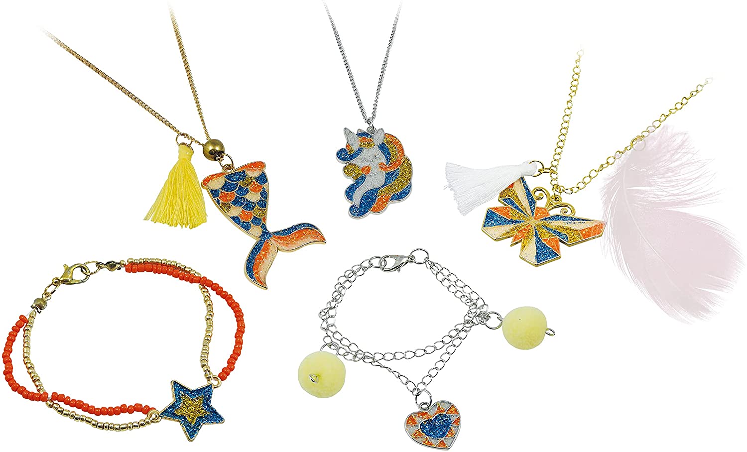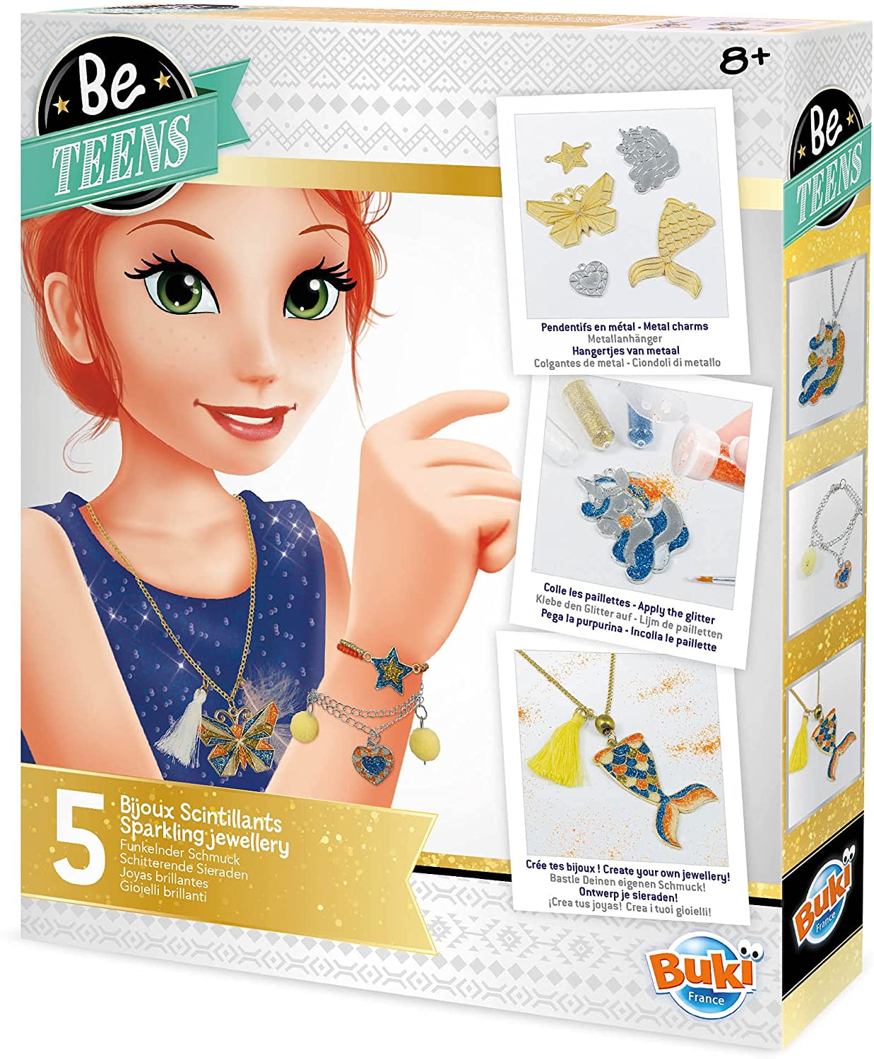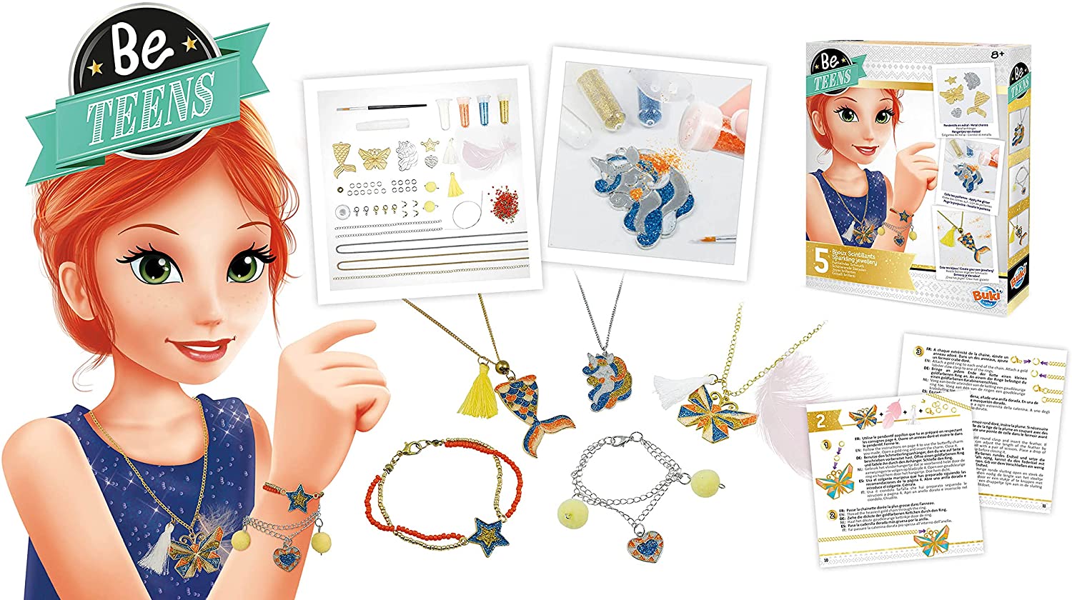 Sady Be Teens sú určené pre kreatívne dievčatá, ktoré chcú byť originálne a vlastné šperky si samy vyrobiť/vytvoriť. Sada Žiarivé šperky obsahuje postup a príslušenstvo na výrobu 5 šperkov s rôznymi motívmi.