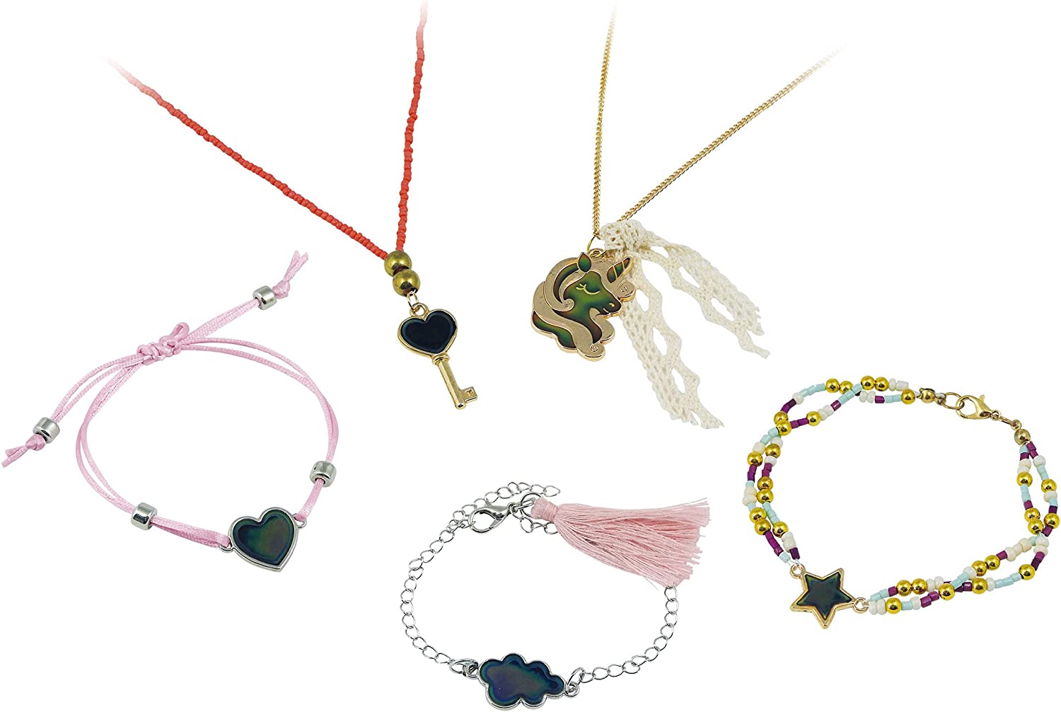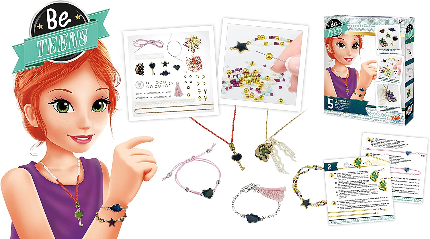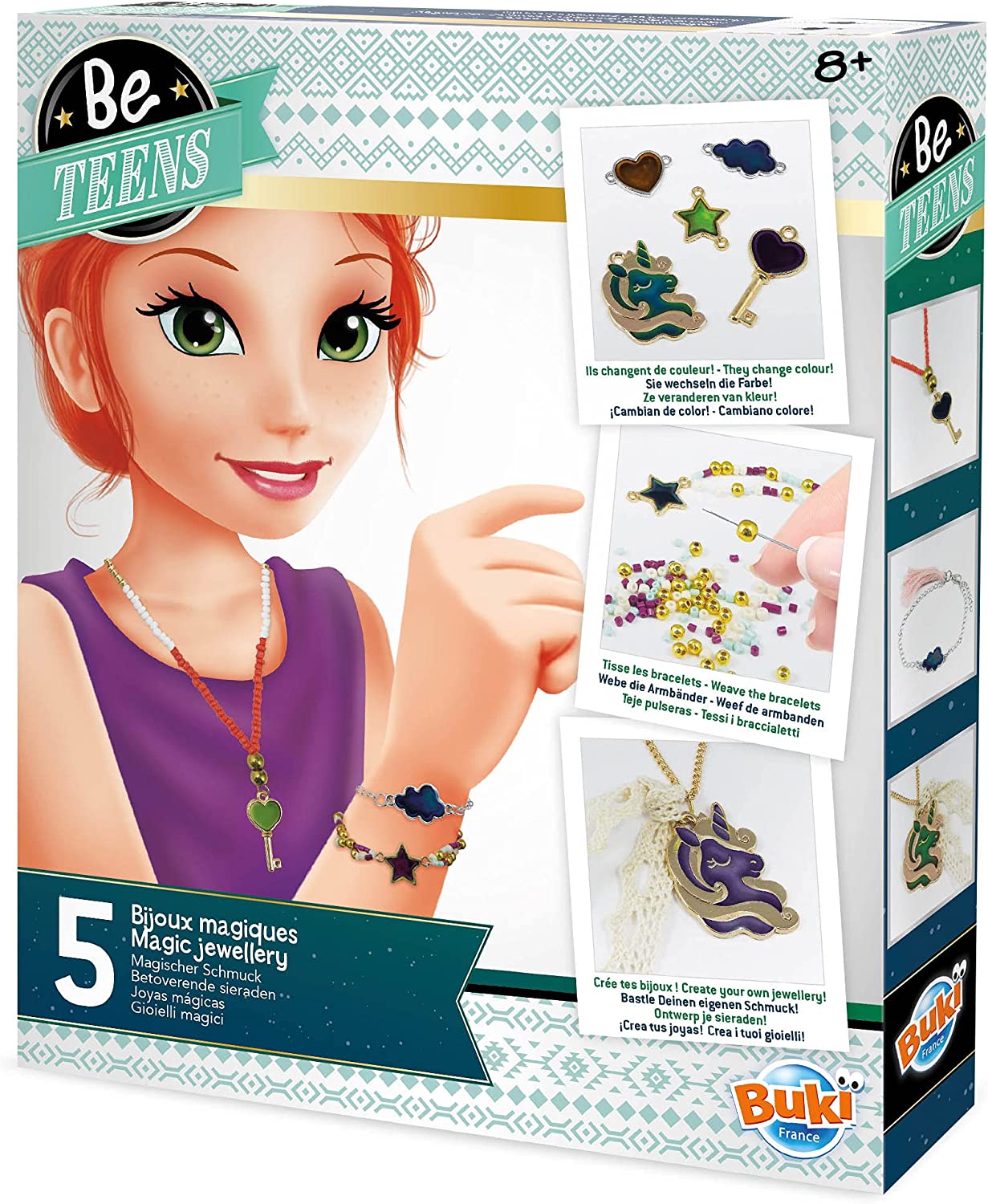 BeTeens Magické šperky od Buki France sú určené pre kreatívne dievčatá, ktoré chcú byť originálne a vytvárať si vlastné šperky. Súprava obsahuje postup a príslušenstvo na výrobu 5 šperkov s magickou schopnosťou zmeny farby podľa okolitej teploty.
