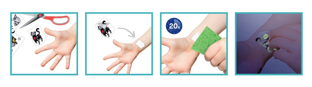 Postup: Nanesenie tetovania trvá len pár minút, stačí priložiť, navlhčiť a nechať uschnúť. Odstránenie je rovnako rýchle, postačí telový krém alebo odličovací olej.